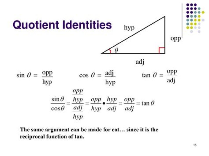 The tangent of x is defined to be its sine divided by its cosine: tan x = sin x cos x . ... The secant of x is 1 divided by the cosine of x: sec x = 1 cos x , and the cosecant of x is defined to be 1 divided by the sine of x: csc x = 1 sin x .
