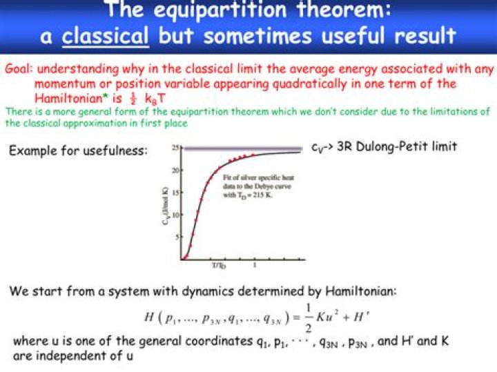 In classical statistical mechanics, the equipartition theorem relates the temperature of a system to its average energies. ... Like the virial theorem, it gives the total average kinetic and potential energies for a system at a given temperature, from which the system's heat capacity can be computed.