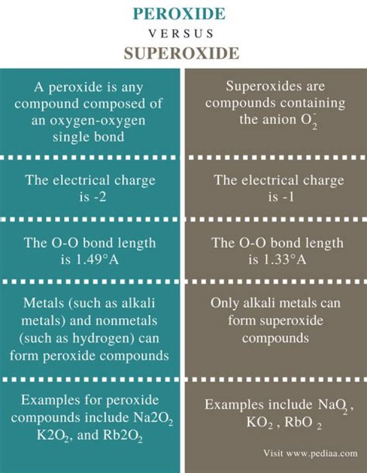Main Difference – Peroxide vs Superoxide Oxides can be oxides containing oxide anions (O2-), peroxides containing peroxide anions (O–) or superoxides containing superoxide anion (O2–). A peroxide is any compound that is composed of an oxygen-oxygen single bond. ... Superoxide is composed of highly reactive oxygen atoms.