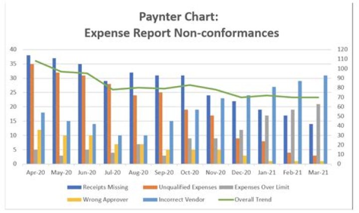A Paynter chart is a chart that combines characteristics of a pareto chart and a run chart. First introduced at Ford Motor Company, they are used when you want to compare multiple categories, most commonly over time.