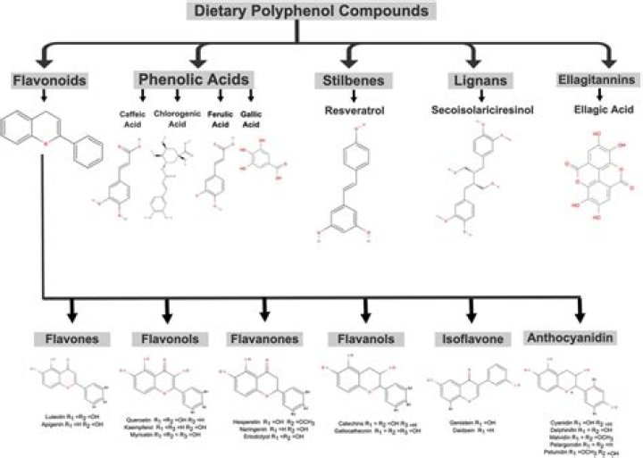 Plant-based foods naturally contain polyphenols; these compounds have wide range of complex structures. ... Depending upon the strength of phenolic ring, polyphenols can be classified in many classes, but the main classes in the polyphenols are phenolic acids, flavonoids, stiblins, phenolic alcohols, and lignans.