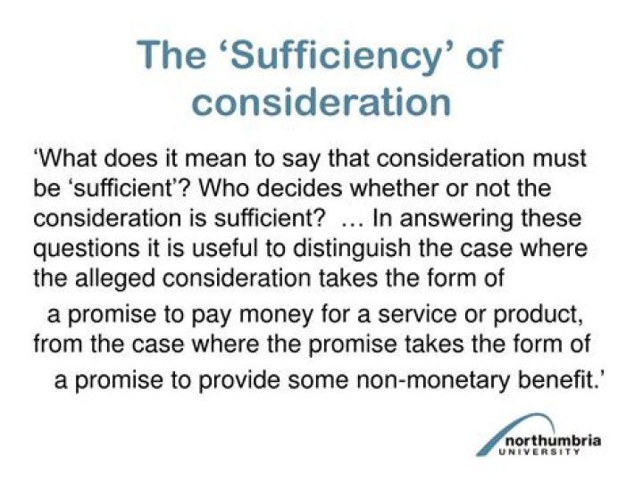 The term “sufficiency” describes something that the courts can see of value that makes the bargain binding, whilst “adequacy” may describe the full value of something. Hence, the law requires consideration to be something of sufficient value, but not necessarily the full or adequate market value.