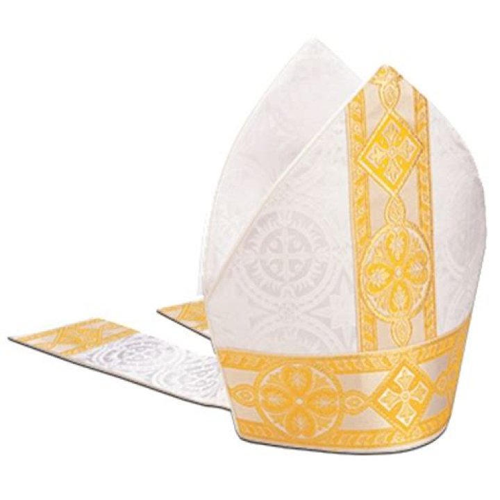Mitre, a high liturgical headdress made of plain white silk (Mitre Simplex) or highly decorated (Mitre Pretiosa) Zucchetto, a small skullcap worn by clerics.