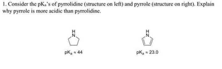 a) Pyrrole (pKa = 17.5) is more acidic than pyrrolidine (pKa ≈ 35) because the anion of pyrrole is more stable than the anion of pyrrolidine.