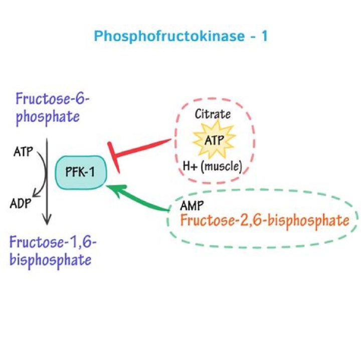 PFK catalyzes the conversion of fructose-6-phosphate to fructose-1,6-bisphosphate in glycolysis. PFK is inhibited by ATP and citrate and positively regulated by AMP.