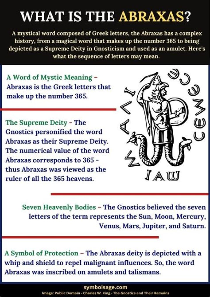 Abraxas (Biblical Greek: ἀβραξάς, romanized: abraxas, variant form ἀβρασάξ romanized: abrasax) is a word of mystic meaning in the system of the Gnostic Basilides, being there applied to the "Great Archon" (megas archōn), the princeps of the 365 spheres (ouranoi).
