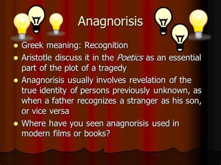 anagnorisis, (Greek: “recognition”), in a literary work, the startling discovery that produces a change from ignorance to knowledge. ... Anagnorisis usually involves revelation of the true identity of persons previously unknown, as when a father recognizes a stranger as his son, or vice versa.
