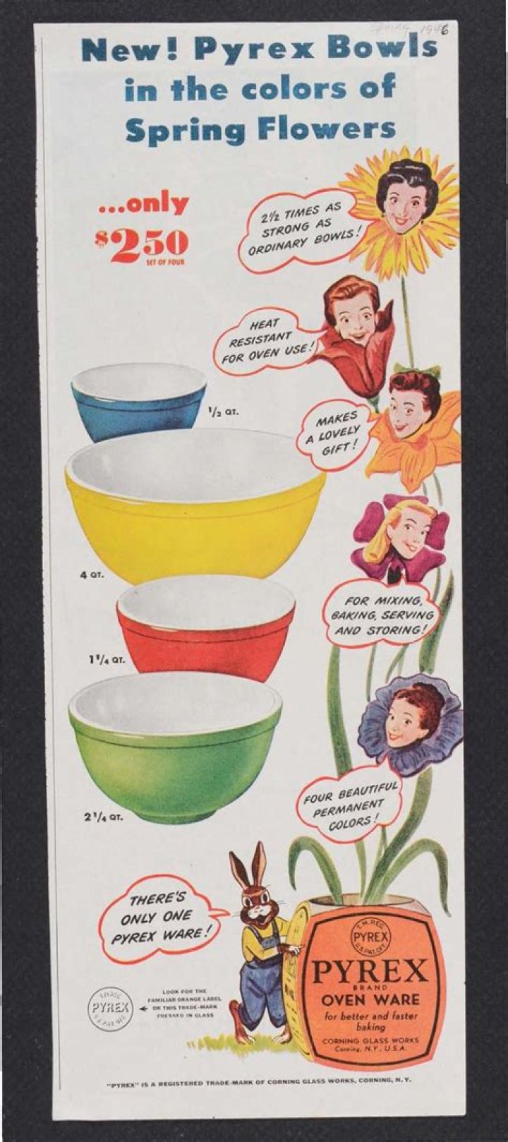 From 1915 to 1947, when colored opalware was introduced, Corning produced only clear glassware. The ubiquitous measuring cups, which are clearly marked, reached the market in 1925. Immediately popular, the cups remain in production and are viewed as must-have items by most home cooks.