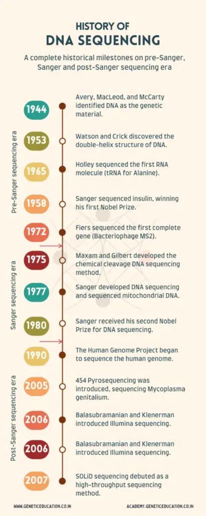 So-called first-generation sequencing technologies, which emerged in the 1970s, included the Maxam-Gilbert method, discovered by and named for American molecular biologists Allan M. Maxam and Walter Gilbert, and the Sanger method (or dideoxy method), discovered by English biochemist Frederick Sanger.