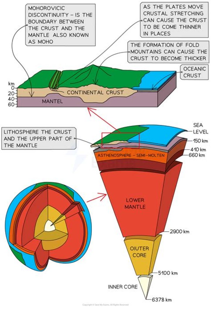 In plate tectonics, Earth's outermost layer, or lithosphere—made up of the crust and upper mantle—is broken into large rocky plates. These plates lie on top of a partially molten layer of rock called the asthenosphere.