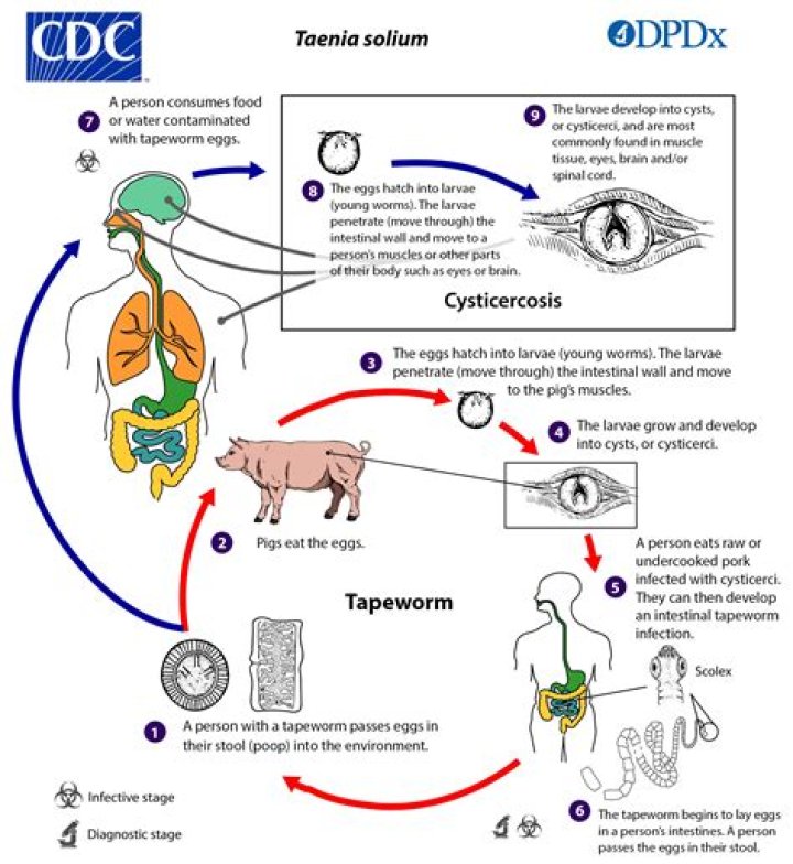 Unlike Taenia solium, for which humans can also act as a dead-end intermediate host leading to the debilitating and stigmatising disease neurocysticercosis, human T. saginata infections are restricted to the definitive (adult tapeworm) stage, which has a more limited public health burden.