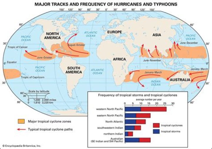 Typhoons occur in the western Pacific Ocean. Tropical cyclones occur in the south Pacific Ocean and Indian Ocean.