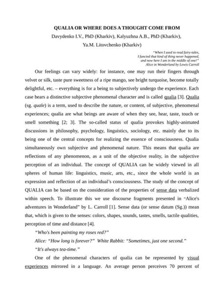 Qualia are experiential properties of sensations, feelings, perceptions and, more controversially, thoughts and desires as well.