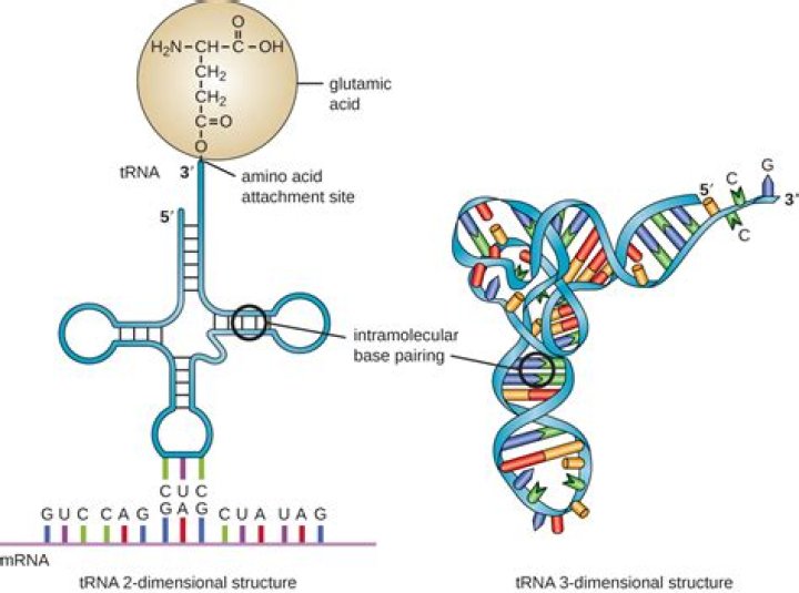 All tRNAs have the sequence CCA at their 3´ terminus, and amino acids are covalently attached to the ribose of the terminal adenosine. The mRNA template is then recognized by the anticodon loop, located at the other end of the folded tRNA, which binds to the appropriate codon by complementary base pairing.