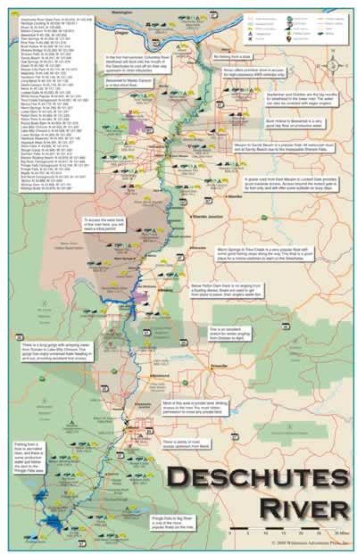 The Deschutes River begins at Little Lava Lake in the Cascades, runs from north to south for 8.4 miles to Crane Prairie Reservoir, east through Wickiup Reservoir, north through Bend to Lake Billy Chinook, and on 120 miles to its mouth at the Columbia River.