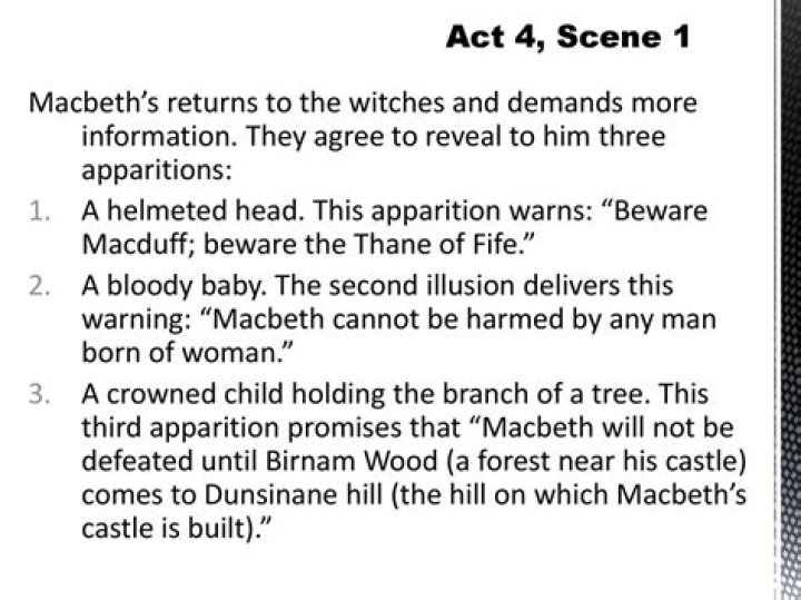 The third apparition of a baby boy holding a tree immediately catches Macbeth's attention with his mark of royalty: a crown. ... The last of these dark specters finishes by telling Macbeth that he'll never be defeated until Birnam Wood marches against Dunsinane, the location of his royal palace.