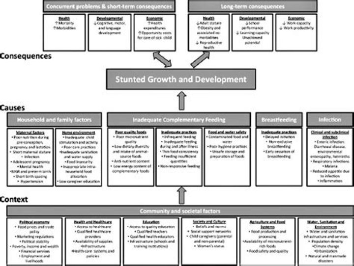 Poor nutrition can cause young children to become stunted, that is, to be too short for their age. In fact, an estimated 159 million children under five worldwide are stunted due to chronic malnutrition. Linear growth retardation, resulting in stunting, begins in utero and continues into infancy and early childhood.