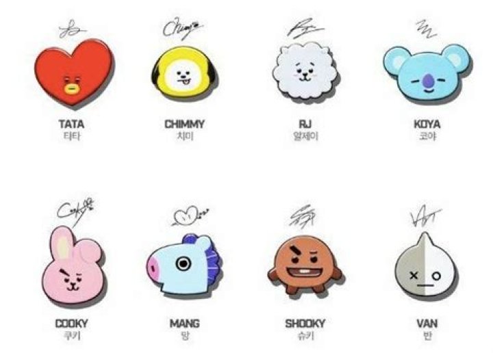 Tata (V), Shooky (Suga), Cooky (Jungkook), Koya (Rap Monster), Chimmy (Jimin), RJ (Jin), Mang (J-Hope). BTS band members cute keychain, a must have for all BTS fans. The characters were created by the BTS members themselves.