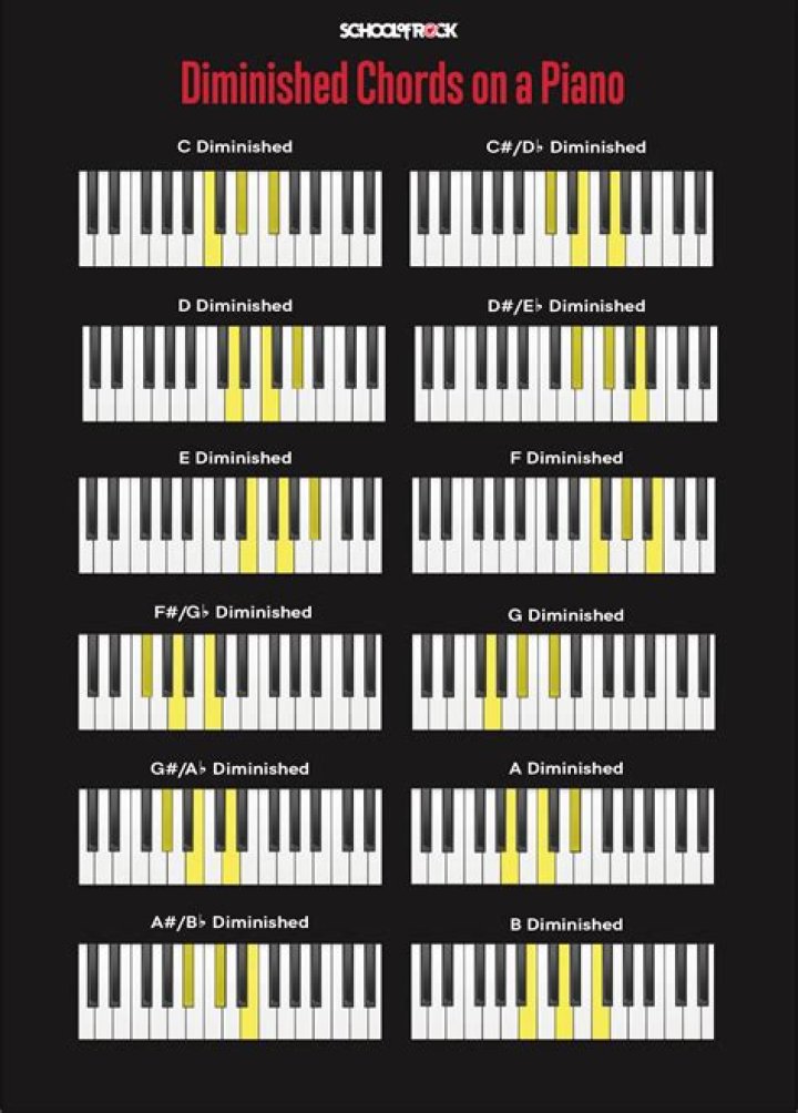A diminished chord is a triad built from the root note, minor third, and a diminished fifth. It's a chord with two minor thirds above the root. Meaning three semitones separate the third and fifth notes of the chord. ... Diminished chords inject a sense of drama, tension, and suspense into music.