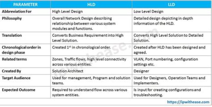 High-Level Design (HLD) — is like a global overview of the network, with a basic description of all the modules and parts, without the unnecessary details, so that the reader can understand the main functions. Low-Level Design (LLD) — add details to the HLD.