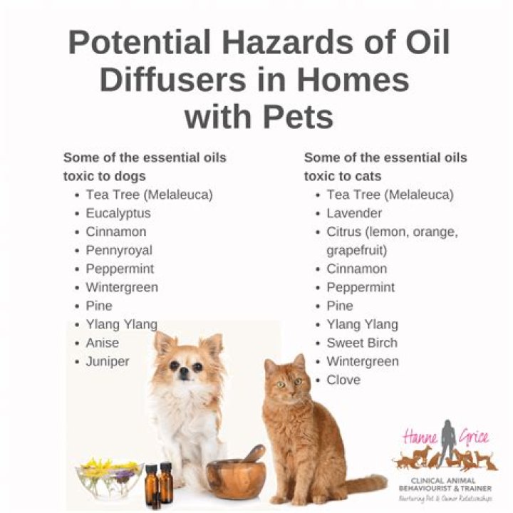 Many essential oils, such as eucalyptus oil, tea tree oil, cinnamon, citrus, pennyroyal, peppermint, pine, sweet birch, wintergreen, and ylang ylang are toxic to pets. These are toxic whether they are applied to the skin OR used in diffusers.