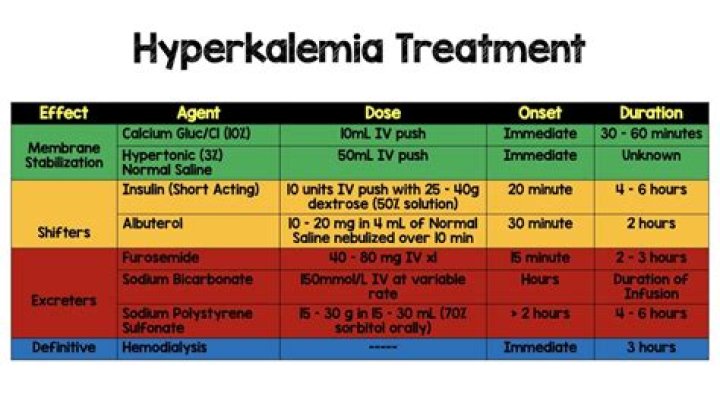 Accepted treatments for hyperkalemia include (1) stabilization of electrically excitable membranes by administration of calcium; (2) shift of potassium from the extracellular to the intracellular compartment by means of sodium bicarbonate, insulin, or albuterol; and (3) removal of potassium from the body by sodium ...