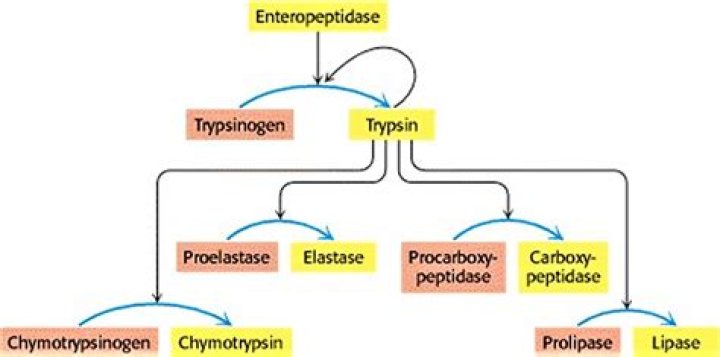 Once acini receive secretory stimulus, these zymogen granules are released in to the lumen of pancreatic duct, which carries the digestive enzymes into the duodenum. Once in duodenum, enteropeptidase activates trypsinogen by removing 7-10 amino acid from N-terminal region known as trypsinogen activation peptide (TAP).