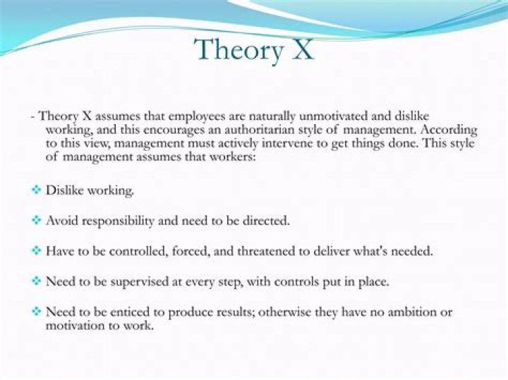 According to McGregor, Theory X management assumes the following: Work is inherently distasteful to most people, and they will attempt to avoid work whenever possible. Most people are not ambitious, have little desire for responsibility, and prefer to be directed.