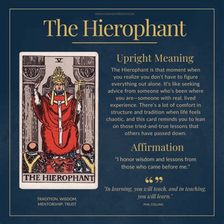 The Hierophant card suggests that it's better for you to follow social structures which are established and have their own traditions. The Hierophant card suggests that it's better for you to follow social structures which are established and have their own traditions.
