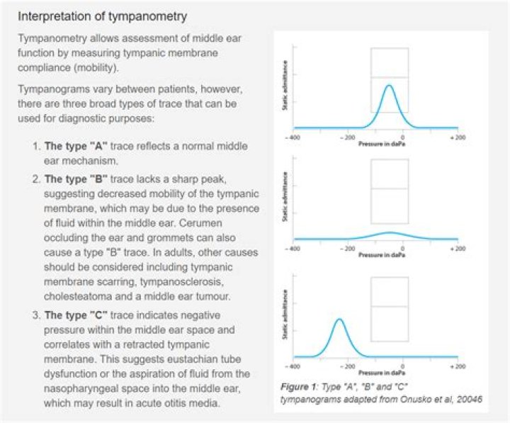 It looks at the flexibility (compliance) of the eardrum to changing air pressures, indicating how effectively sound is transmitted into the middle ear. ... A typical tympanometry result indicates the ear canal volume (cm3), the max pressure (daPa) and the peak compliance (ml).