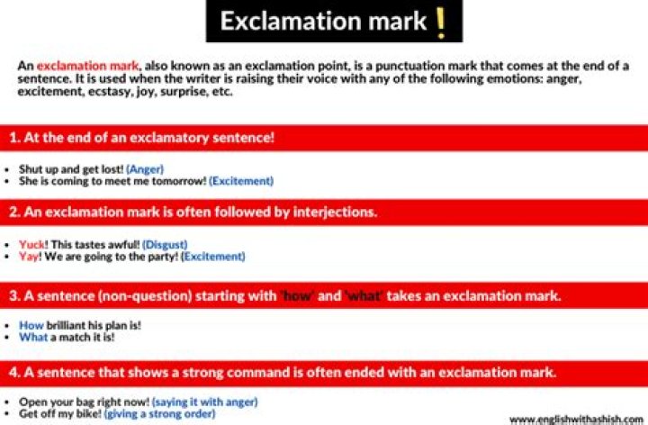 More Punctuation Rules:- Rule 1. Use an exclamation point to show emotion, emphasis, or surprise. ...