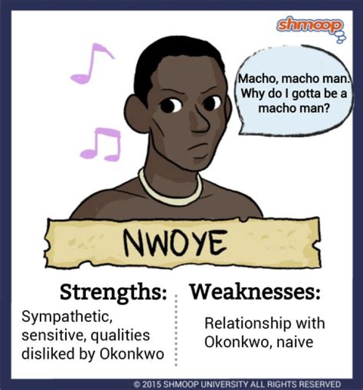Nwoye: Nwoye is the total opposite of Okonkwo. He is gentle, compassionate, and solicitous of others. Nwoye's mild manner irritates his father (Okonkwo), and he receives many beatings for it.