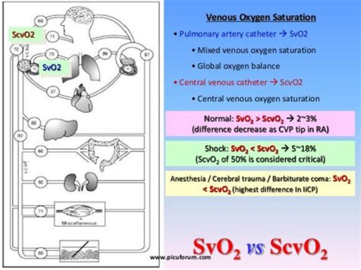 Central (ScvO2) is normally slightly lower than mixed (SvO2), but is often higher than SvO2 in patients in shock.