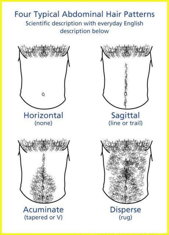 In response to rising levels of androgens (mainly testosterone) during and after puberty, the skin of the abdomen begins to produce coarser, longer and more pigmented hair (terminal hair). ... Some women may develop a small line of hair from the pubic area up to the navel.