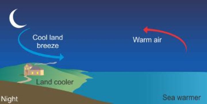 A land breeze is a local nighttime and early morning wind that occurs along coasts and blows offshore (from the land out to sea). It arises at sunset when the sea surface is warmer than the adjacent land due to the land having a lower heat capacity and cooling off faster.