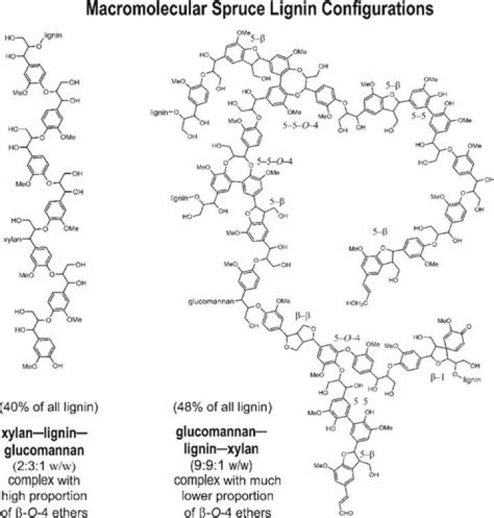 Recent research has confirmed that lignin and hemicelluloses are covalently bound and form lignin–carbohydrate complexes [1, 54]. There is now more information about the bonds between lignin and cellulosic molecules. Eriksson et al. [55] suggests a fractional bonding between lignin and cellulose units in softwoods.