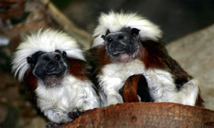 Cotton-top tamarins are named for the shock of white hair encircling their heads, a look reminiscent of Albert Einstein. Roughly the size of a squirrel, cotton-top tamarins also have white chests and bellies, while their backs and tails are covered in long black and brown fur.