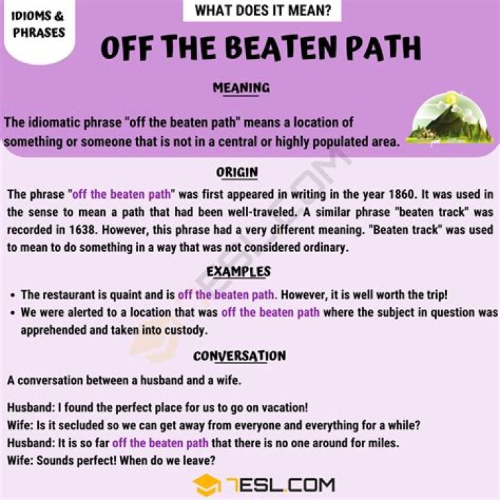 An unusual route or destination, as in We found a great vacation spot, off the beaten track. This term alludes to a well-worn path trodden down by many feet and was first recorded in 1860, although the phrase beaten track was recorded in 1638 in reference to the usual, unoriginal way of doing something.
